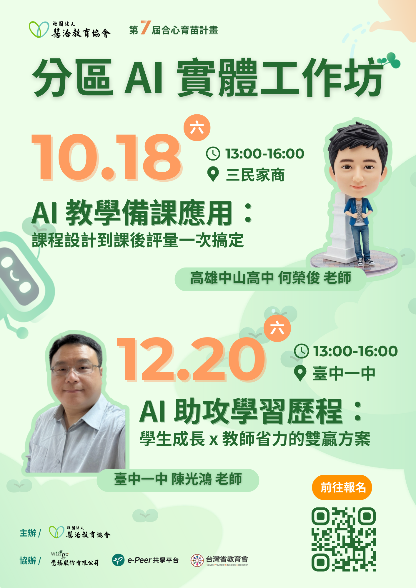 轉知:社團法人慧治教育協會【第七屆合心育苗計畫 114- 1 AI實體工作坊】之訊息