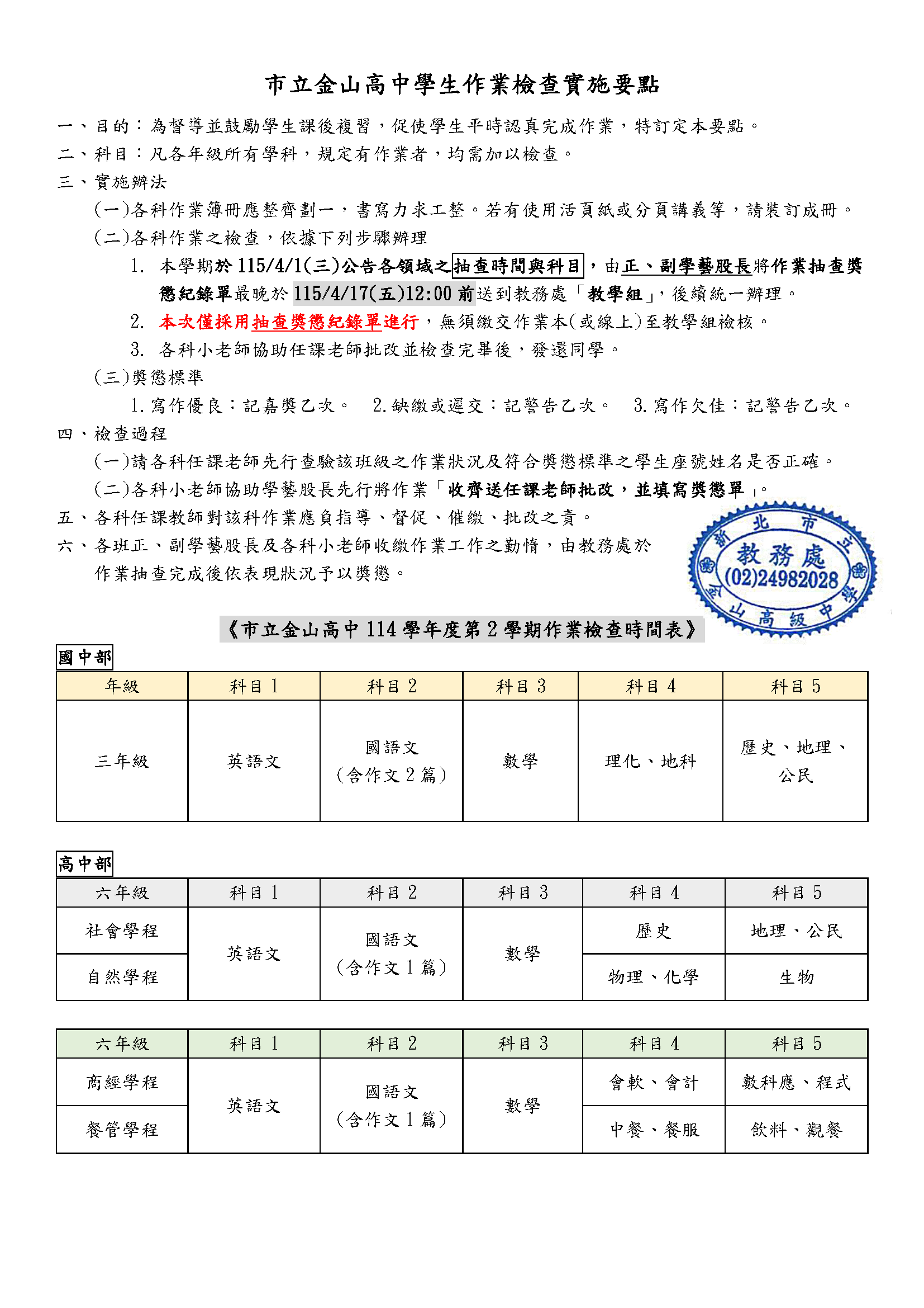 【作業抽查】本校114學年度第2學期(高三、國三)作業檢查實施要點及抽查流程 - 新北市立金山高級中學
